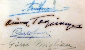 A clip from a testimonial,* signed by appreciative members of an Italian community in 1956. In the subsequent sixty years, note how one of the substances in the black ink has spread out around the signature, giving it a sort of halo. Ink can be funny like that. It’s one of the reasons artists use “archival-quality” materials–the idea is that they aren’t going to do this. Not sure how they know.