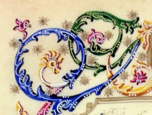 This is DR9 R30, but there’s nothing much in the catalogue about it, which is too bad. It’s a token of appreciation for someone from his co-religionists, in Italian, dated Genoa 1956 (click image to see bigger). We’re looking at it because it has a pretty border, more or less; nothing particularly innovative or unusual I think, a modern presentation of a mediaeval style, but it’s a nice example of how you can use very simple techniques to make a very dramatic document.